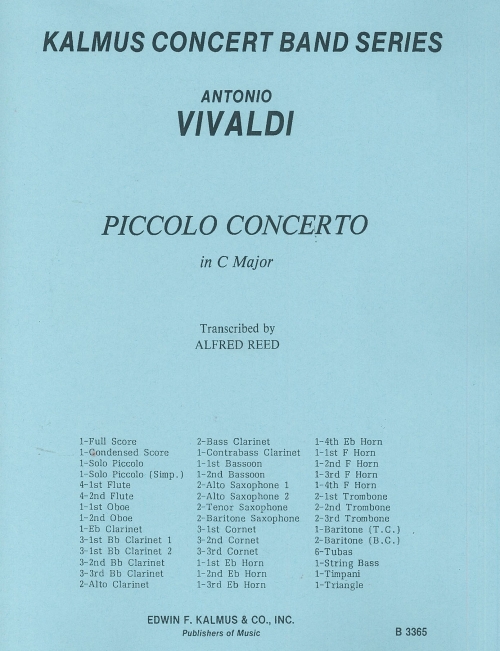 【アルフレッド・リードの改訂によりフル・スコアーが付きました】この曲は、もともとはリコーダと弦楽器それにチェンバロのために作曲された曲です。このリコーダはイタリアで「フラウティーノ」と呼ばれたピッチの高いリコーダで、そのための曲をリードが吹奏楽伴奏のピッコロ協奏曲に改編したものです。曲は3つの楽章からできていて、第1楽章はアレグロ・3/4拍子で、序奏のあと16分音符の音型によるソロがはじまります。中間部はイ短調からヘ長調、ホ短調などへと転調して展開したあと、再びハ長調へもどり、オーケストラの演奏で終わります。第2楽章はゆっくりとしたホ短調・12/8拍子のシチリアーノで、はじめのテーマは2回目に繰り返される時や変奏曲風に扱われます。中間部には3連符のパターンが多くあらわれ、転調しながら進んで行く、この部分も2回繰り返されます。美しい印象的な楽章です。第3楽章はハ長調・4/4拍子のアレグロ・モルトで、快活な楽章でピッコロが16分音符で動き回ります。中間部では短調に転調し、再びハ長調にもどり、終わります。ソリストのグレードは5。アルフレッド・リードの編曲。