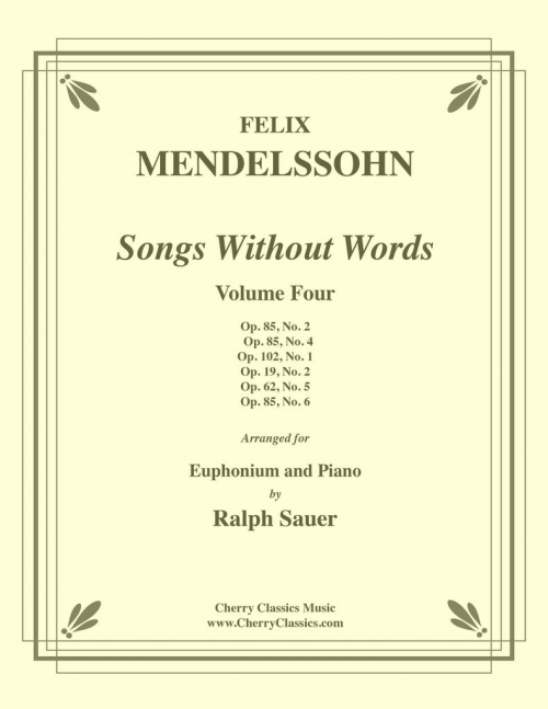 ラルフ・ザウアーは、メンデルスゾーンの数多くの無言歌曲集の中から6曲をユーフォニアムとピアノのために編曲しました。第4巻。メンデルスゾーンは生涯を通じてピアノのための歌曲集を8巻作曲しました。これらの曲は、その美しさと親しみやすさから、たちまち人気を博しました。「歌曲集」は、ほとんどが叙情的で、この上なく美しい作品です。ザウアー氏は、これまで未開拓だったこの貴重な素材を発掘し、ユーフォニアムのレパートリーに計り知れないほどの付加価値をもたらしました。