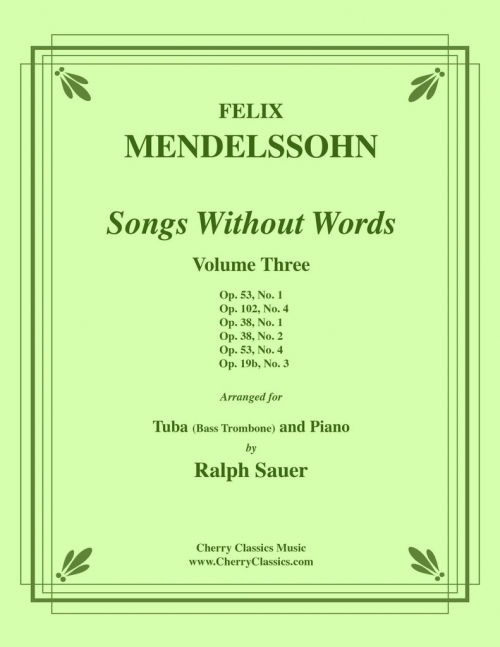 ラルフ・ザウアーは、メンデルスゾーンの無言歌曲集第3巻から6曲をテューバ(バストロンボーン)とピアノのために編曲しました。メンデルスゾーンは生涯を通じてピアノのための歌曲集を8巻作曲しました。これらの作品は、その美しさと親しみやすさから、たちまち人気を博しました。「歌曲集」は、ほとんどが叙情的で、この上なく美しい作品です。ザウアー氏は、これまで未開拓だったこの貴重な素材を発掘し、テューバとバストロンボーンのレパートリーに計り知れないほどの貢献を果たしました。